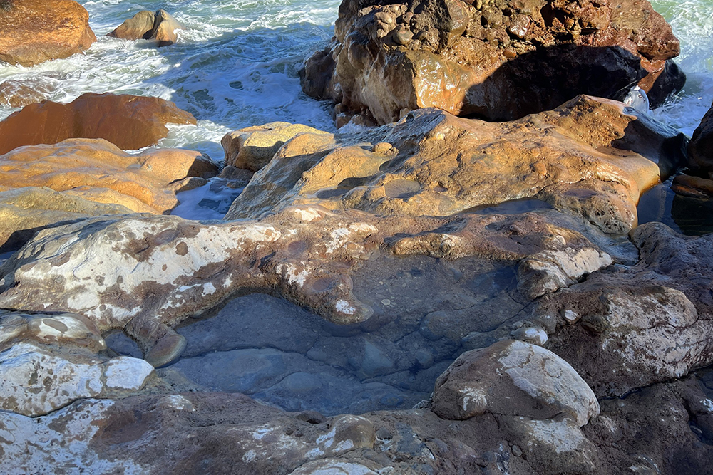 ガイドさんの案内で、背丈ほどの草むらや道なき道を進み、穴之浜へ。潮だまりを見ると、ふつふつ海水が湧いている場所がいくつかありました。岩のくぼみにハマるようにして、ちゃぽん。この浜ではカメを幾度か見かけ、キズを癒しにやってきているのかな、と想像が膨らみます。