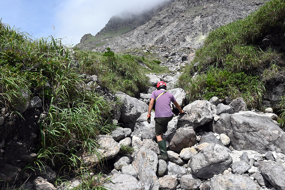 ネイチャーガイドと一緒に硫黄岳山麓の噴気孔を目指します。登山時は、ヘルメットとガスマスクを装着。小さな岩でも上から落ちてきたら、要注意です。