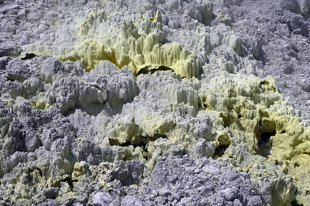 そして硫黄成分でネオングリーンに変色した噴気孔のエリアへ。鍾乳石のような岩の原のところどころに白い煙が立ち上り、足裏も心なしか熱を感じます。石は少し力を入れるだけで、パラパラと砕けます。目の前に広がる草木のない、白と蛍光グリーンの城塞のような光景は、かえって自分の生について意識が向けられるかもしれません。